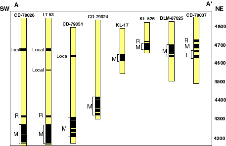 Figure 10. Coal-correlation diagram A-A\022, showing coal beds in the Wyodak coal interval. Datum is elevation (ft) above sea level; no horizontal scale. Note variations in thickness in the Main Wyodak coal bed and in number of partings. This Main Wyodak interval is shown in detail in Figure 11. See Figure 3 for the location of Line A-A\022. R, Rider Wyodak; M, Main Wyodak; L, Lower Wyodak coal beds; Local, unnamed coal bed of limited areal extent.