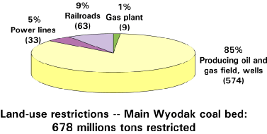 Figure 18. Chart showing land-use restrictions for the Main Wyodak coal bed (Category 1 restrictions). The chart segment for "Cemetery" is too small to be shown at this scale. Numbers in parentheses are in millions of short tons. |