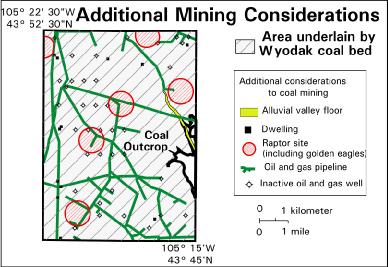 Figure 6. Map of Hilight quadrangle showing area underlain by the Wyodak coal bed, and showing Category 2 considerations: other land-use and technologic considerations that would need to be resolved before surface mining could occur. These areas could probably be available for mining with certain mitigations and stipulations.