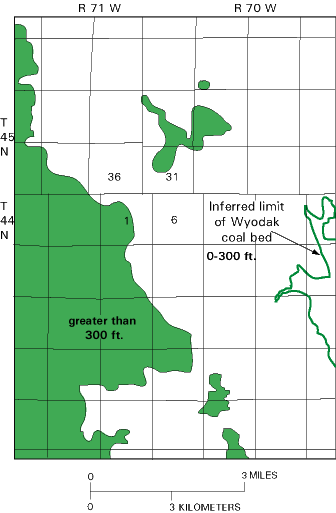 Figure 8. Map of Hilight quadrangle showing areas where overburden for the Main Wyodak coal bed is 0-300 ft thick (white), and areas where this overburden is greater than 300 ft thick (green). For the purposes of this study, we assumed that 300 ft of overburden would be the limit for surface mining. Maximum overburden for the Main Wyodak coal bed in the Hilight quadrangle exceeds 600 ft.