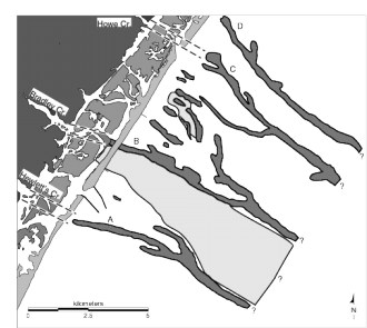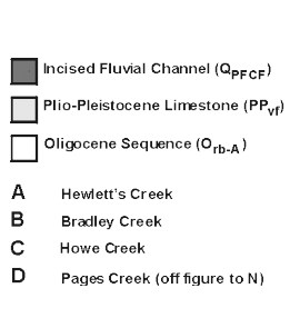 Figure 2. Geologic map of the shoreface and inner shelf off Wrightsville Beach, showing the distribution of Tertiary and Quaternary rocks and sediments based on the seismic and sidescan-sonar data of Thieler (1997). The Oligocene section is ubiquitous, except where it is replaced by Plio-Pleistocene (PPvf) and Quaternary (QPFCF) lithosomes. Note the association of modern tidal creeks with the major paleofluvial channels (labeled A-D and connected by dashed lines). (Modified after Thieler 1997.)