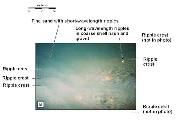 Sidescan-Sonar Imagery of the Shoreface and Inner Continental Shelf, Wrightsville Beach, North CarolinaFigure 6B: This diver photo from the same location shows the sharp contact between coarse and fine sediments at the northern boundary of the rippled scour depression. Ripple wavelengths in the rippled scour depression (right side of the photo) are approximately 75-100 cm, with heights about 20-30 cm. The rippled, finer sediments on the left of the photo have wavelengths of 10-20 cm and heights 3-8 cm. Diver observations indicate thatthe contact is sharp, occurring over a few centimeters. Coarseripple crests can be traced under the fine sand for several meters,suggesting that fine material periodically infills the edges of therippled scour depression (see Figure 7 and text for discussion).