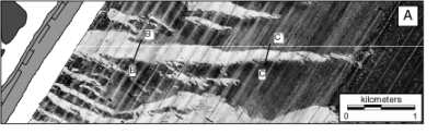 A: The rippled scour depressions on the Wrightsville Beach shoreface are up to 1 m deep, and are floored by coarse shell hash, sand and gravel. As shown here, as well as in Figures 1 and Figure 6 , the northern edges (contacts between coarse and fine sediments) of the rippled scour depressions are sharp. The southern contacts, however, appear more ragged or "wisply."