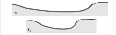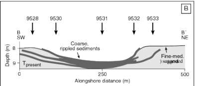 B: A schematic diagram showing the changes in rippled scour depression width through time (T1, T2, T3, Tpresent) suggested by the course-fine sediment stratigraphy in the cores shown in Figure 8.