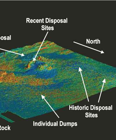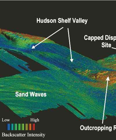 Figure 3. Perspective view of the northern portion of the survey region showing sea floor topography and sediment backscatter, looking southwest and across the shelf and toward the head of the Hudson Shelf Valley. This image was created by vertically exaggerating the bathymetry (in this case 20 times), artificially shading the relief (by artificially illuminating the relief, in this case from the north), and then draping the color-coded backscatter intensity over the bathymetry. Within each backscatter color (red is high backscatter, blue is low backscatter), the intensity varies from dark to light depending on the sun illumination. High backscatter generally indicates a hard bottom, such as coarse-grained sediments or rock; weak backscatter indicates a soft, non-reflective bottom, such as fine-grained sediments. The vertical exaggeration accentuates the small-scale variability of the bathymetry (relief of a few meters) that would be difficult to show in a traditional contour map. Features include: relatively smooth topographical highs composed of material dumped since the 1800's; mounds (as high as 10m) of dredged material from more recent disposal; a smooth, roughly circular region resulting from disposal of contaminated sediments and capping with course sand; outcrops of southeastward-dipping coastal plain strata at the head of the Hudson Shelf Valley of probable cretaceous-age; low-relief (amplitude <1m) sand waves suggesting sediment transport to the Southwest; individual features that are interpreted to be dumps of material, some arrange in lines, which are probably rocks; low-backscatter, smooth sediment extending to the east from the region of recent disposal; low backscatter fine-grained sediments in the axis of the Hudson Shelf Valley.