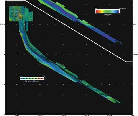 Upper Hudson Shelf Valley and Adjacent Shelf, Offshore of New York Figure 4. Bathymetry of Hudson Shelf Valley as measured in the multibeam survey. The color-coded image shows deeper regions in blues, shallow in reds. The lower images shows the sediment backscatter intensify draped over the shaded bathymetric relief, as in Fig. 3. This image was created by vertically exaggerating the bathymetry (in this case 4 times), artificially shading the relief (in this case by illumination from 350(at an elevation of 45(), and then draping the color coded backscatter intensify over the bathymetry. Within each backscatter color (red is high backscatter, blue is low backscatter), the intensity varies from dark to light depending on the illumination. High backscatter generally indicates a hard seafloor, such as rock or coarse-grained sediments, weak backscatter indicates a soft sea floor, such as fine-grained mud. The axis of the valley is floored with fine-grained sediments. A survey planned for the fall of 1998 will expand coverage down the valley and onto the adjacent shelf.