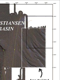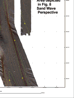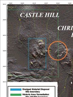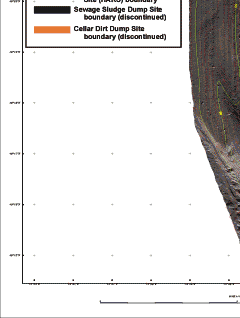 Figure 5. Map showing shaded-relief bathymetry (contoured at 2m intervals) for the northern portion of the survey area. The boundaries of the Dredged Material Disposal Site, the Historic Area Remediation Site, and the discontinued Sewage Sludge and Cellar Dirt Dumpsites are also shown. The image was created by vertically exaggerating the bathymetry (in this case 5 times) and illuminating the relief from 350 (at an elevation of 45). The map shows much small-scale relief and texture to the surficial morphology that is not captured by the 2 m contours. See the text for description of principal features.