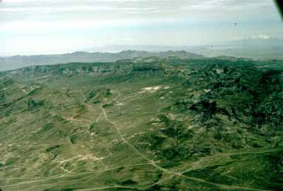 SLIDE 1 (above or left) is an aerial view looking north at the eastern part of (from left to right) Spor Mountain, The Dell, and most of the Thomas Range in 1978. The excavations in the left foreground, within the southernmost part of Spor Mountain, include the Bell Hill fluorspar mine. The Yellow Chief open pit uranium mine is visible in the center of the photo. The cliffs beyond are flows of Topaz Mountain Rhyolite of Miocene age. Beyond the cliffs is the Dugway Range. The principal area of beryllium mining is out of view, to the lower left of the photo. More aerial views (SLIDES 2-9) includes photos of beryllium mines.
