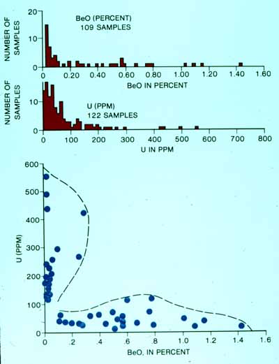URANIUM: Anomalous amounts of uranium are broadly associated with beryllium ore but, at the Roadside ore body, the principal uranium anomaly (100-200 ppm) underlies beryllium ore. The major thorium anomaly (100-150 ppm), in contrast to uranium, follows beryllium ore. Below the beryllium ore, thorium levels decline to crustal background values. The ratio of thorium to uranium (>4) rises to crustal background.