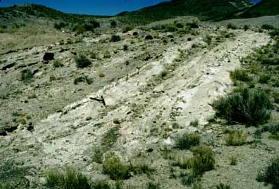 SLIDE 47 (above or right) shows one of the few natural outcrops of the beryllium tuff remaining in 1969, south of Spor Mountain. Other natural exposures are found in The Dell. The few natural outcrops may be atypical in that they do not contain abundant clasts of carbonate rock. Tuff with carbonate clasts (SLIDES 48-49) is well-exposed in mines and prospect pits on the southwest side of Spor Mountain. Carbonate-clast tuff was formed by explosive eruption of the Spor Mountain Rhyolite through carbonate rocks of Paleozoic age.