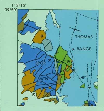 SLIDE 16 (table above or left) summarizes the geologic history of volcanism and mineralization in the Deep Creek-Tintic belt. SLIDE 17 (geologic map below) shows rocks and structures of the Thomas Range and northern Dugway Range. Both the table and map were prepared in 1980. The unit identified on the map as Oligocene "Needles Range Formation" has since been determined to be of local origin, and is no longer considered to correlate with the Needles Range.