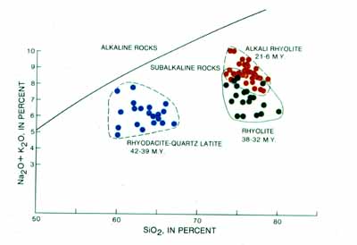 SLIDE 46 (above or right) is a total alkali-silica diagram of volcanic rocks in the Thomas Range and northern Drum Mountains. It illustrates the compositional differences among the three stages of volcanism. Plots of trace element content are given by Lindsey (1982).