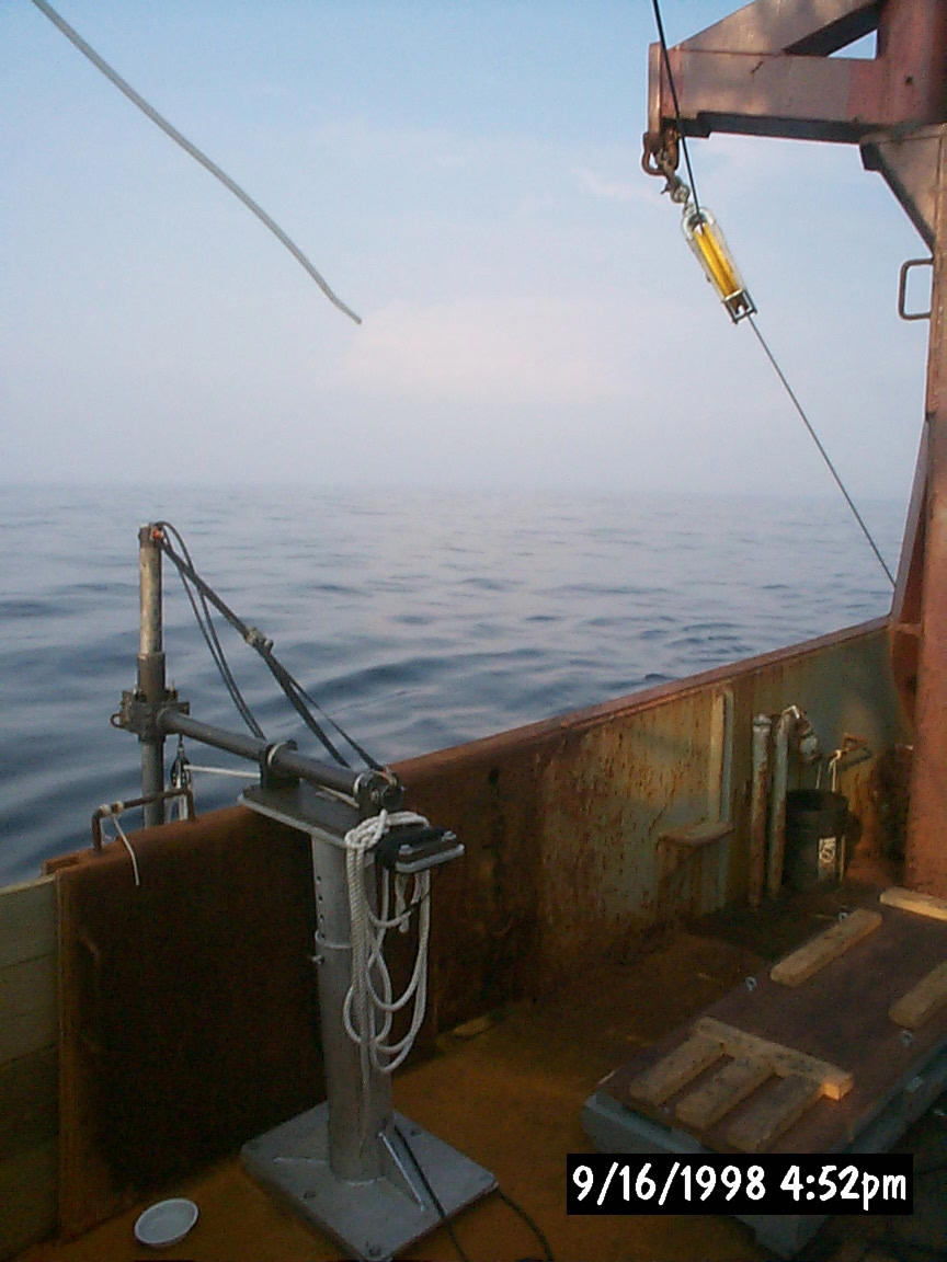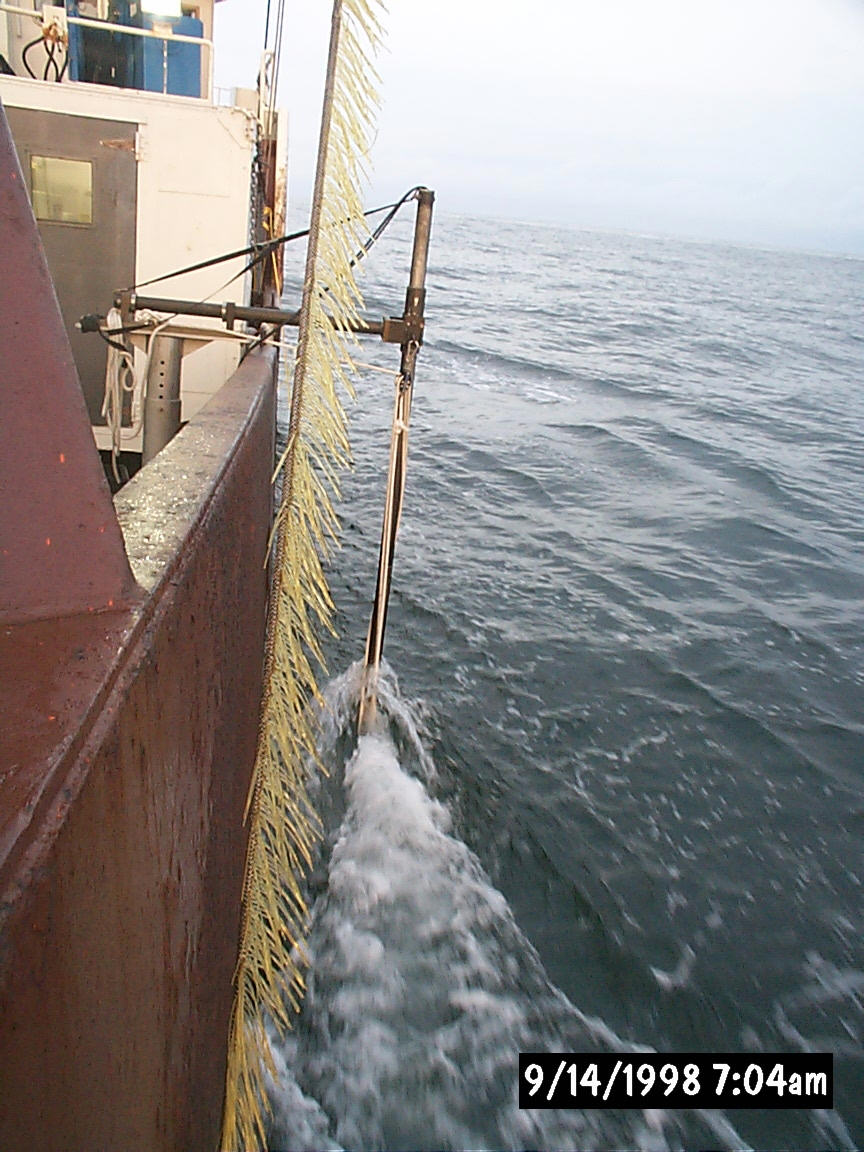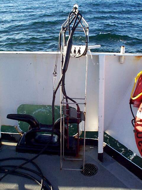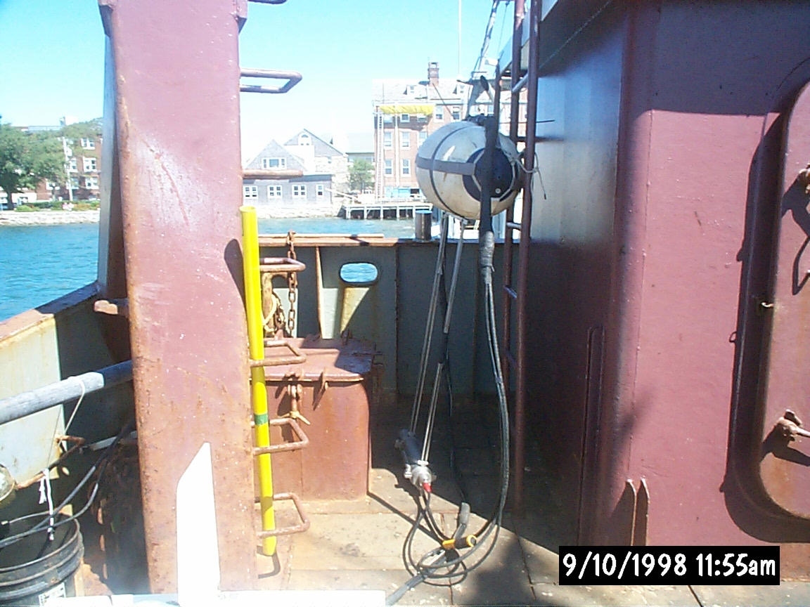 3) Starboard aft side showing sidescan cable (uper right). Sidemount (lower left) for