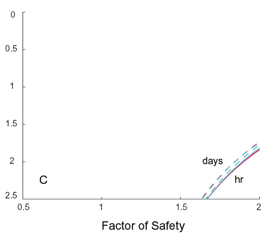 Figures 5A-5B show the pore water pressure response in the soil to rainfall durations of 4-16 hr and 1-4 days, respectively when the water table is initially at 2 m. Lines in these figures are calculated from equations 5a and 5b, respectively. The dot-dash line represents the hydrostatic pressure at time =0 s and the dotted line represents the pressure-depth curve when the top of the water table is at the surface (WT=0 m). In Figure 5A, the pressure increases slowly at shallow depths during the 16 hr infiltration period (each colored line represents 4 hr; green = 4 hr, blue = 16 hr), but never at depths where failure occurs. In Figure 5B, the pressure increases slowly at depths below 1.5 m during the 4 days after the infiltration period (each colored line represents 1 day; green = 1 day, blue = 4 days). The change in hydrostatic pressure after 4 days is not sufficient to cause slope failure over this time period as demonstrated in Figure 5C where the factor of safety remains greater than 1. Similar results occur when the water table is raised to 1 m. These conditions would not induce the landslides observed from the June 1995 storm in Madison County, Virginia.
