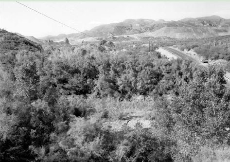 at left and right with small trees in the foreground, and large tamarisk