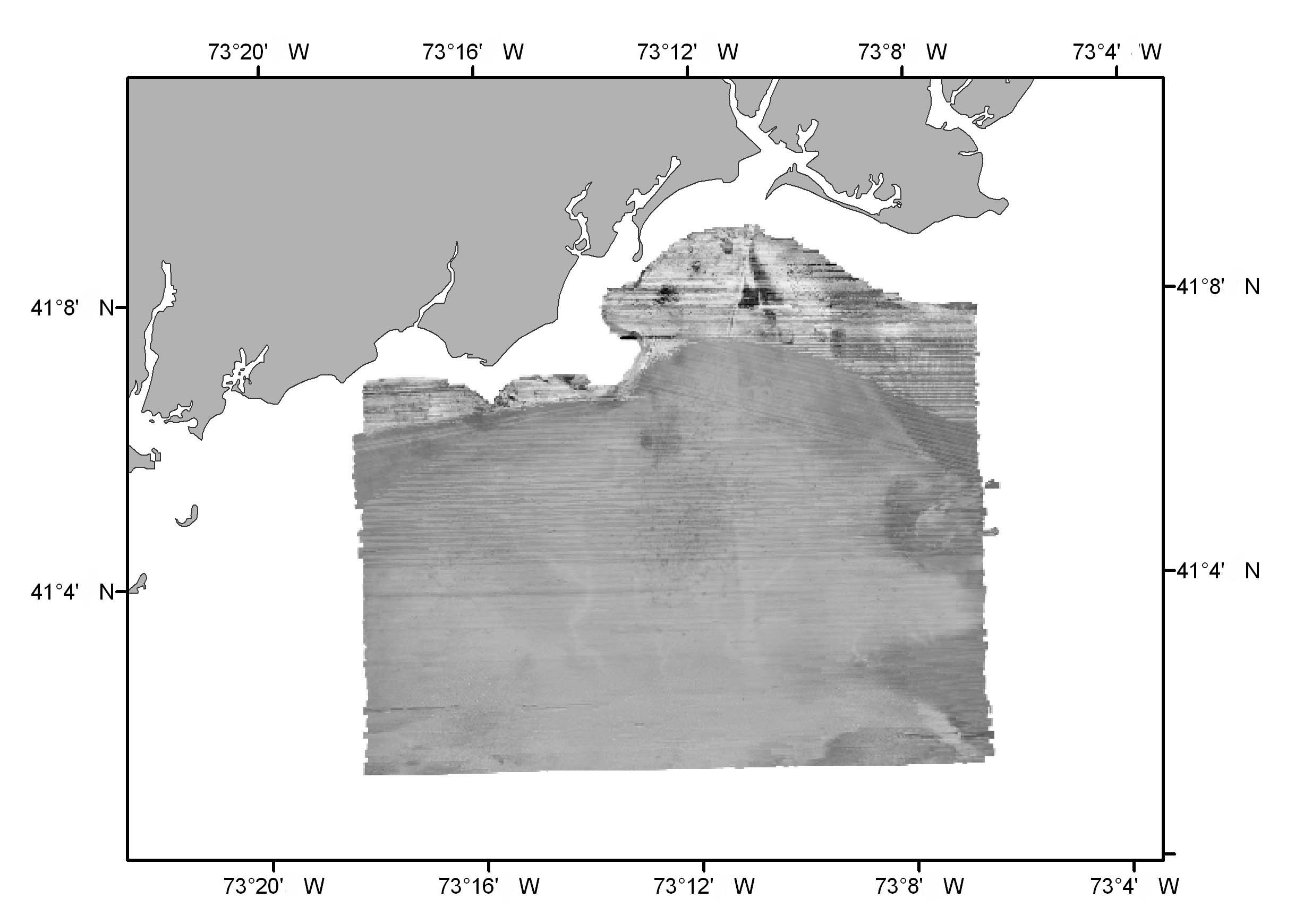 Sidescan-Sonar Imagery: 24 bit grayscale, composite sidescan-sonar mosaic produced by NOAA of survey h11045 off Bridgeport, Connecticut (UTM zone 18, WGS84 spheroid). Click for larger image. | ||
