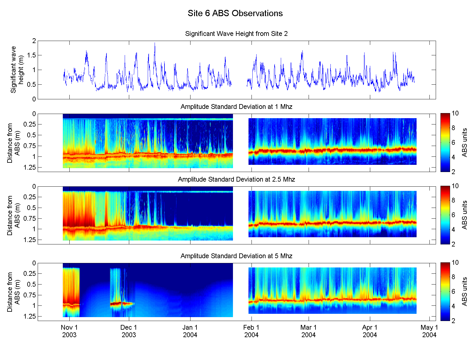 Animation of Sonar Data: The changing condition of the sediment bed at site 7B can be viewed as animation using media player that supports .avi files. In the top panel of the animation, backscatter intensity of the sediment bed is shown in the grayscale image, with ADV current speed noted in red. ADV current speed and direction are also indicated by the magnitude and orientation, respectively, of the red arrow. An estimate of sea floor ripple wavelenth and the direction towards which are propagating are noted in cyan. The orientation of the cyan arrow indicates the wave direction, whereas the magnitude of the cyan arrow indicates the estimate of sea floor ripple wavelength. This magnitude has been multiplied by 5 for visual purposes. The bottom panel shows significant wave height at site 7B. The red dot in this panel coincides with the time provided in the image in the top panel. At site 6 the sonar was tilted upward and (or) flooded so no sea floor images were recovered.