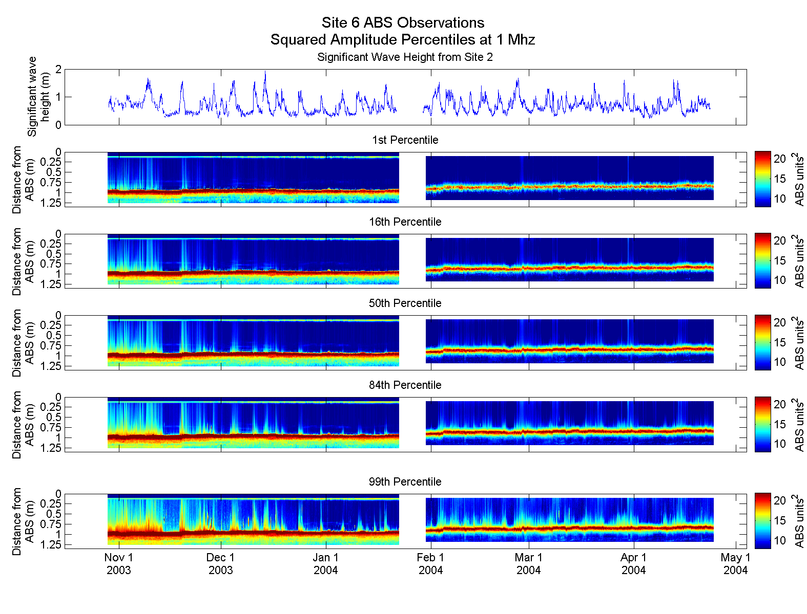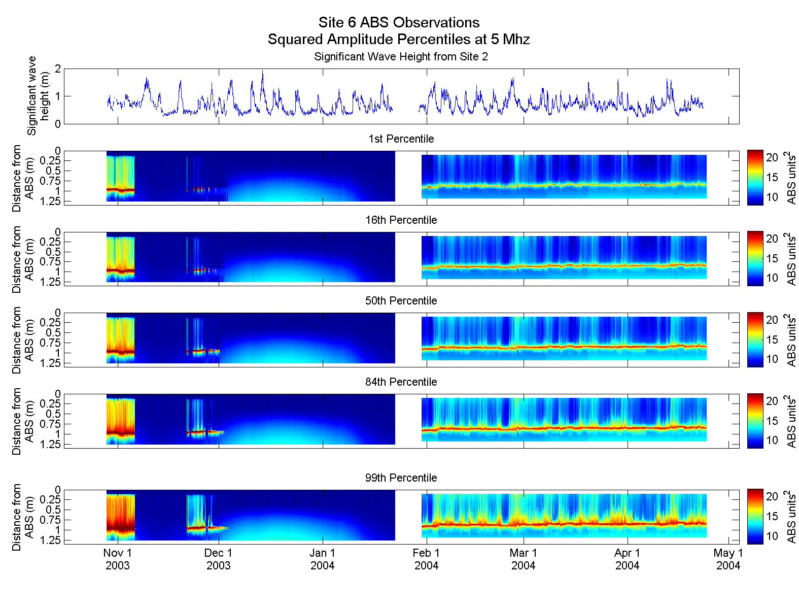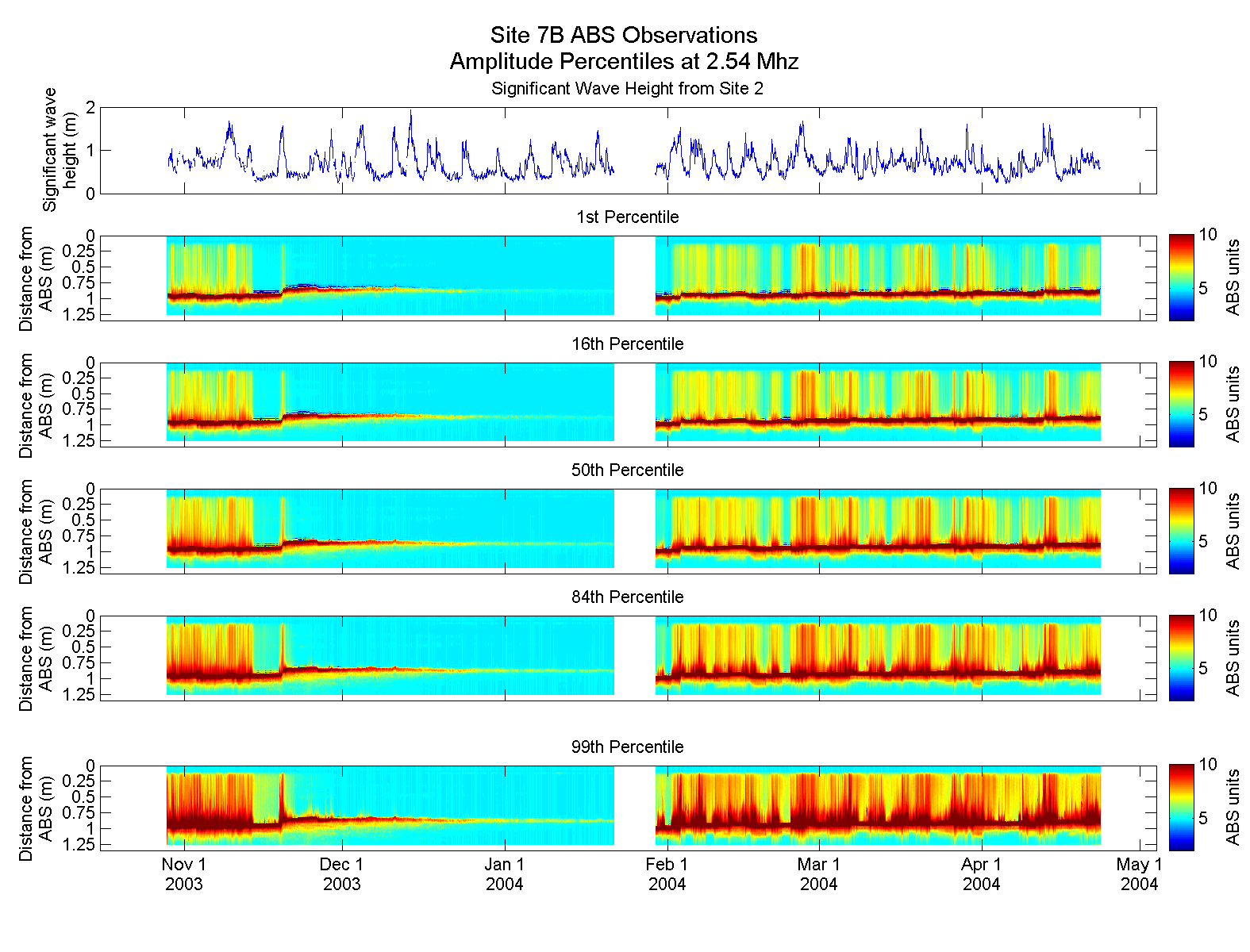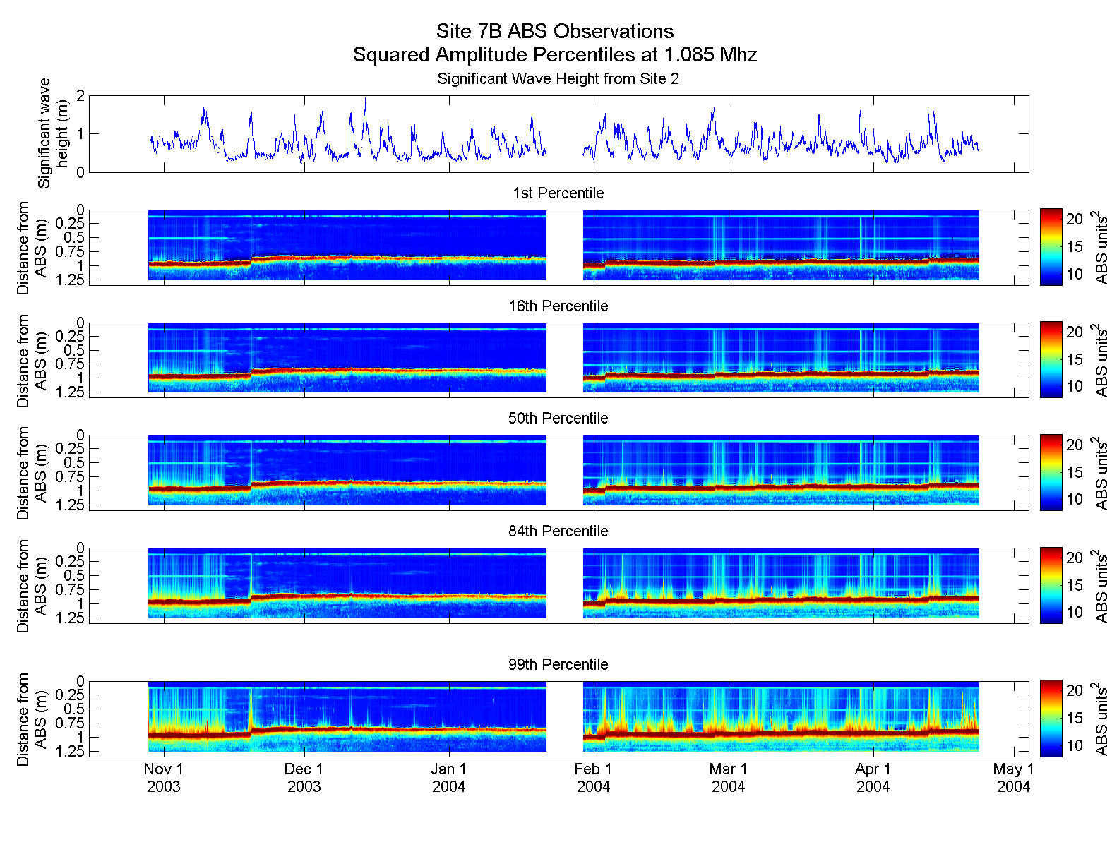 Unfiltered Acoustic Backscatter Sensor (ABS) observations: Burst-mean statistics calculated from ABS data at Site 6, Site 7A, and Site 7B. Statistics include the burst-mean, standard deviation, and percentiles for the ABS' three transducers. Squares of these statistics were also calculated. Both pdf and png versions are provided. Please note that due to the complexity of these figures, the pdf version may load slowly.