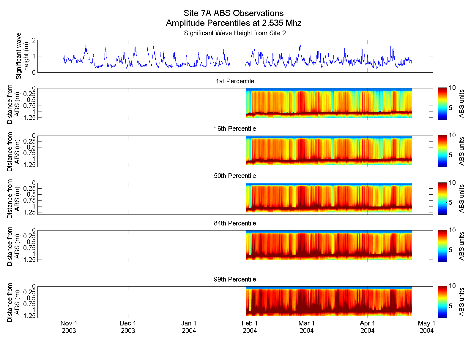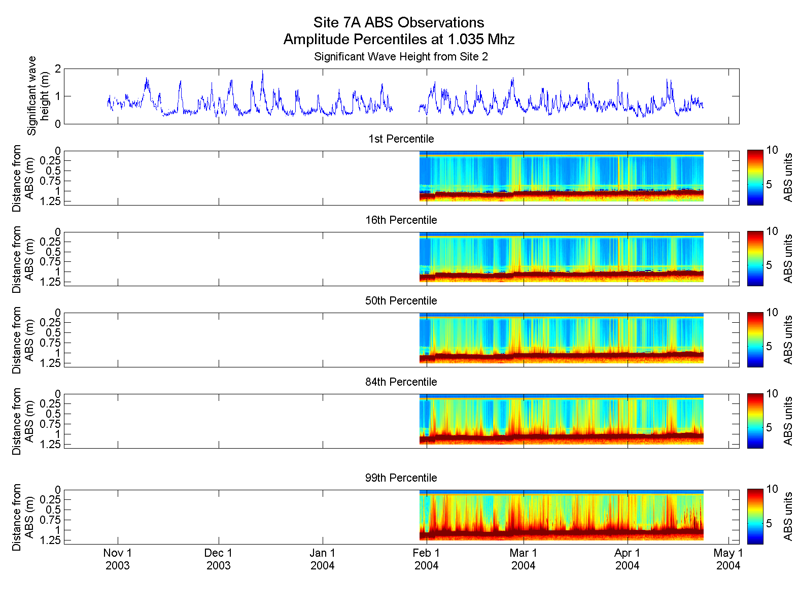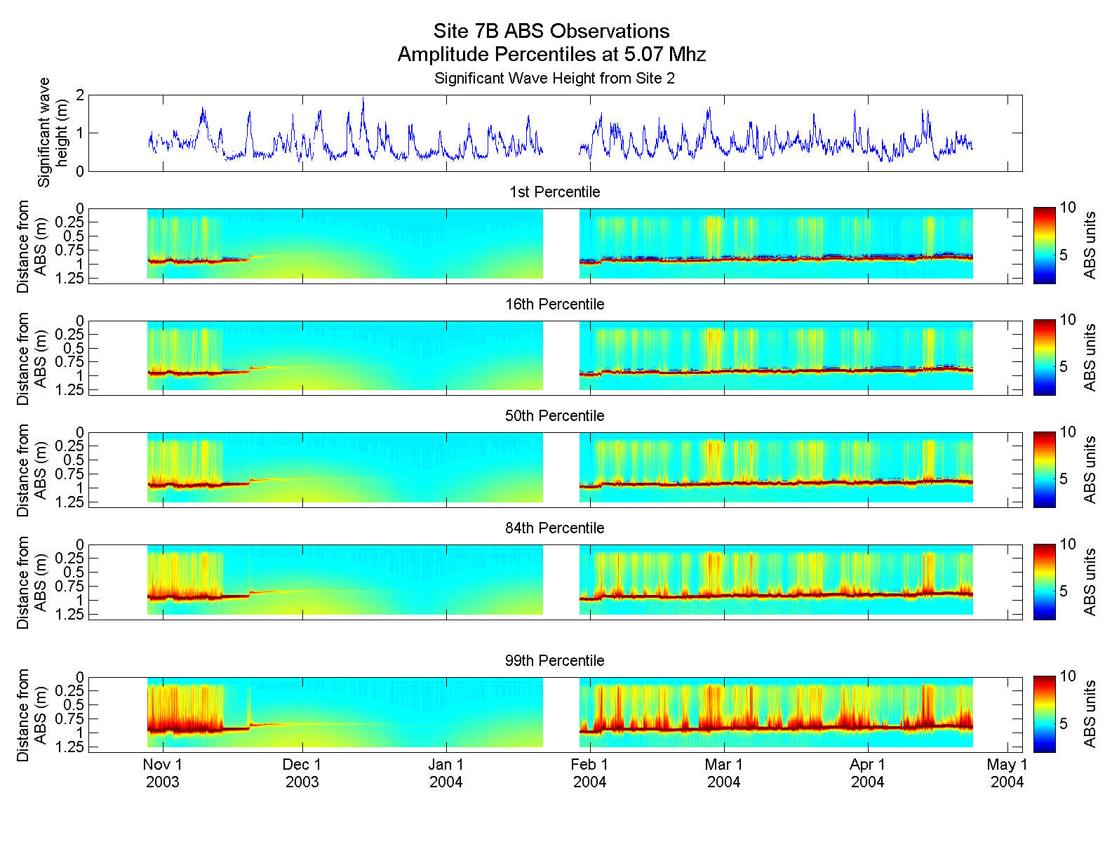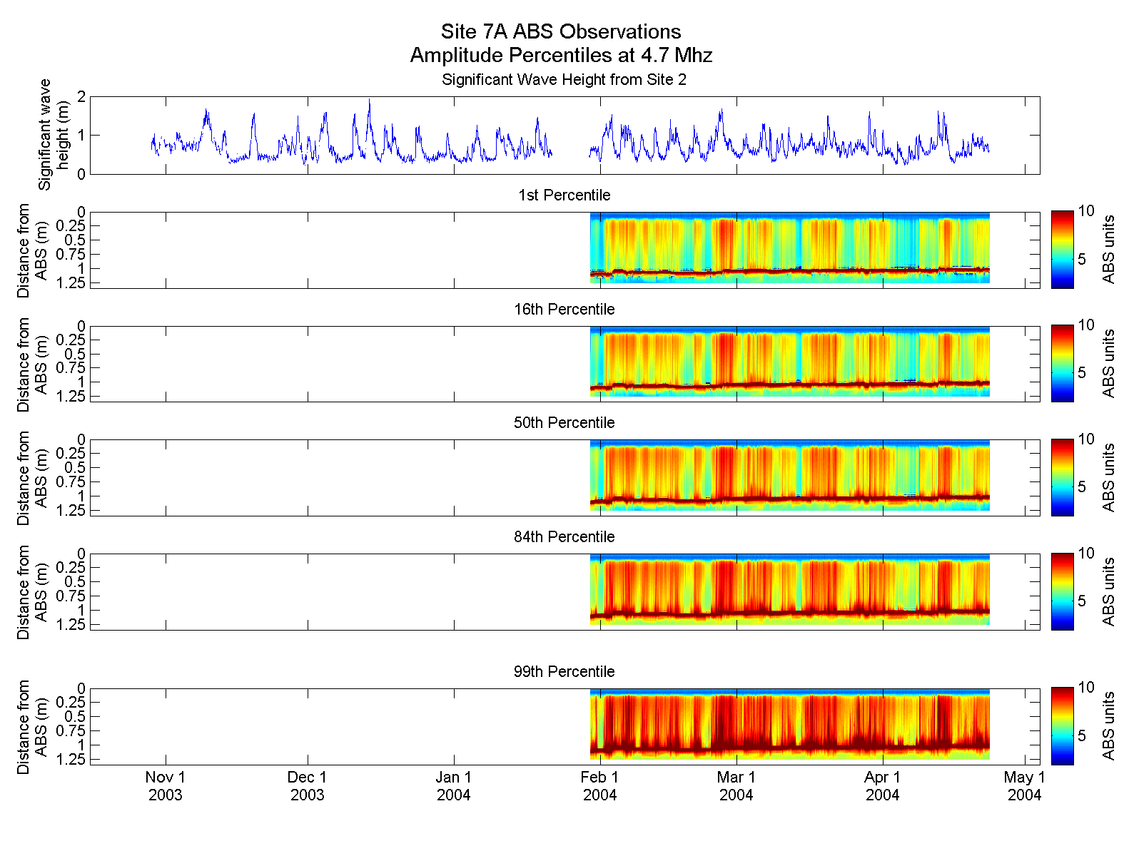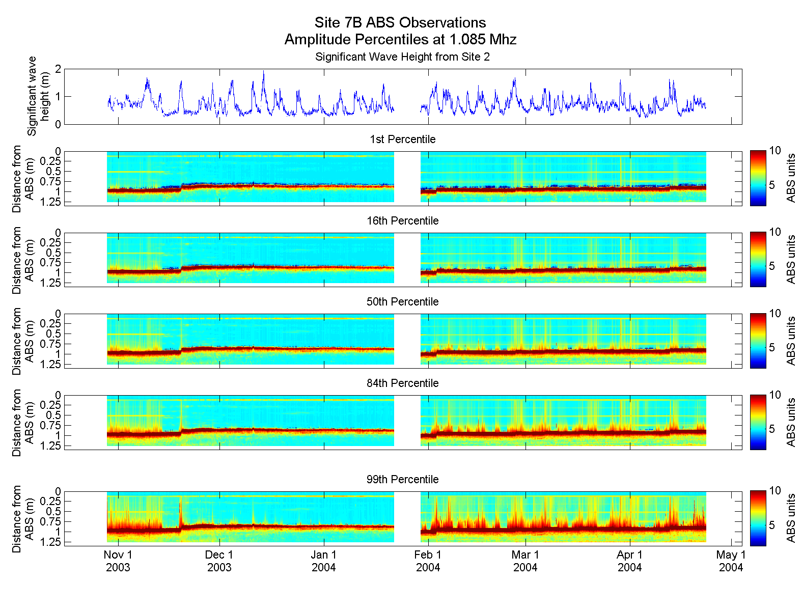 Unfiltered Acoustic Backscatter Sensor (ABS) observations: Burst-mean statistics calculated from ABS data at Site 6, Site 7A, and Site 7B. Statistics include the burst-mean, standard deviation, and percentiles for the ABS' three transducers. Squares of these statistics were also calculated. Both pdf and png versions are provided. Please note that due to the complexity of these figures, the pdf version may load slowly.