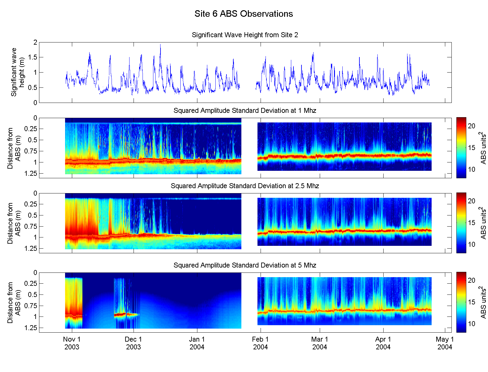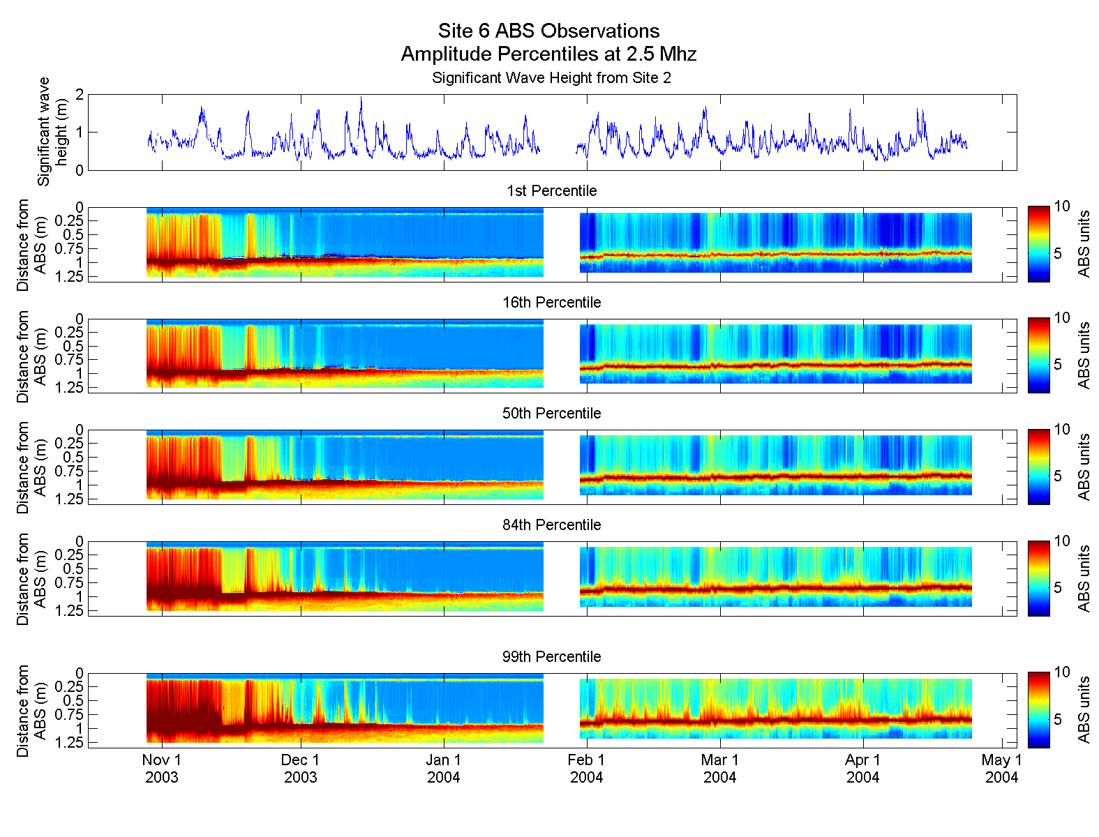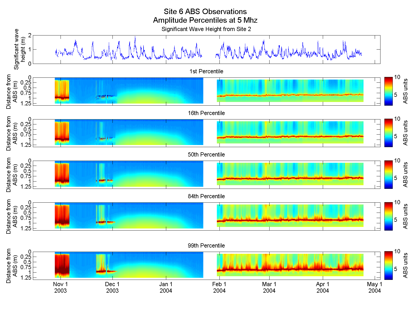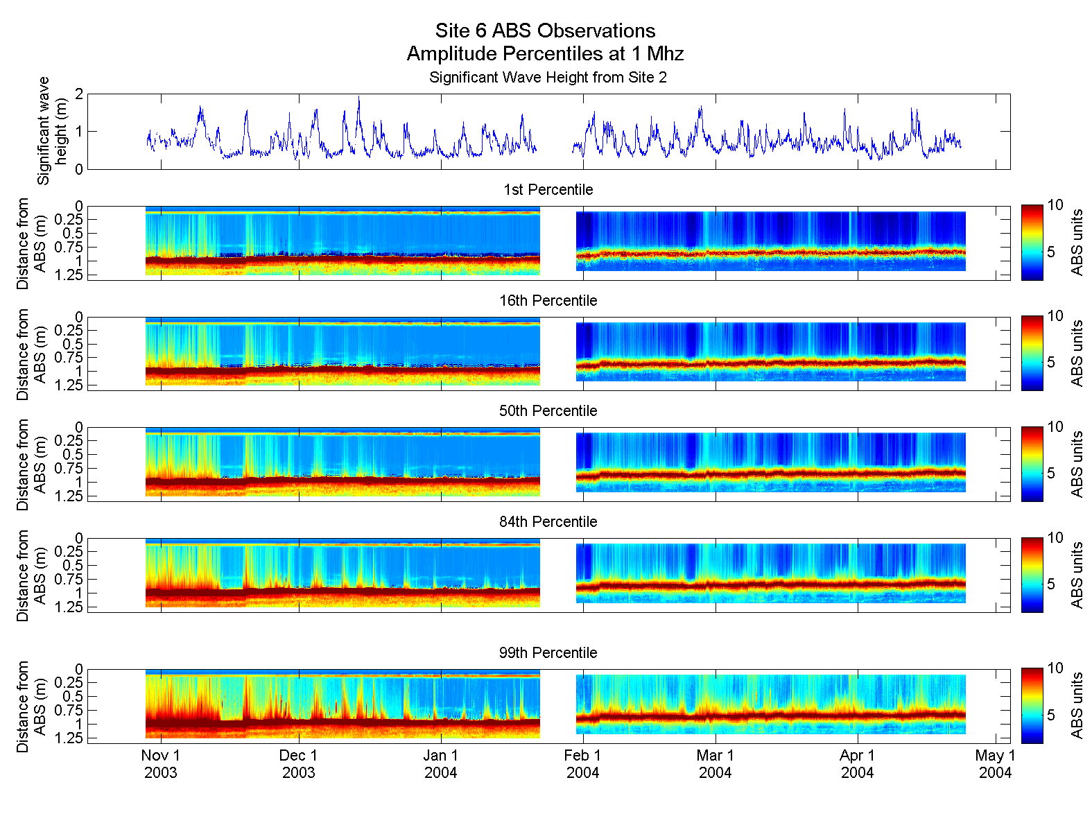 Unfiltered Acoustic Backscatter Sensor (ABS) observations: Burst-mean statistics calculated from ABS data at Site 6, Site 7A, and Site 7B. Statistics include the burst-mean, standard deviation, and percentiles for the ABS' three transducers. Squares of these statistics were also calculated. Both pdf and png versions are provided. Please note that due to the complexity of these figures, the pdf version may load slowly.
