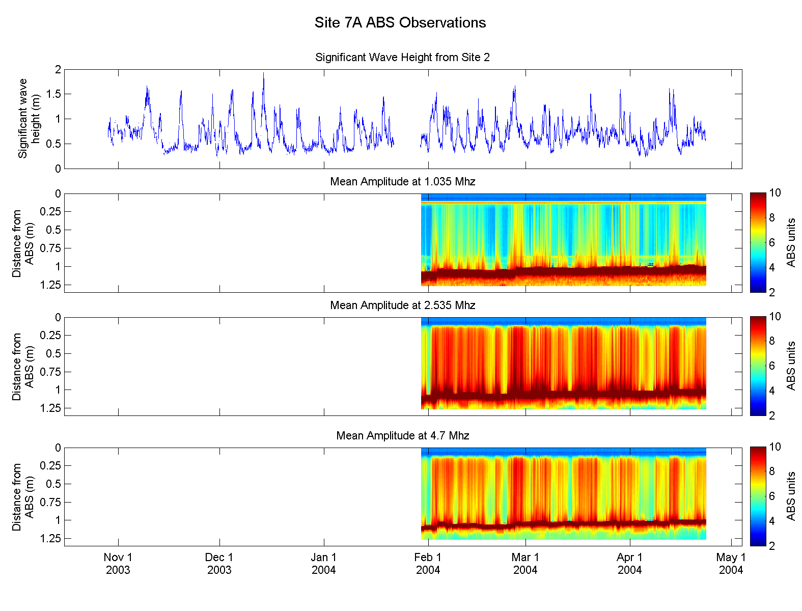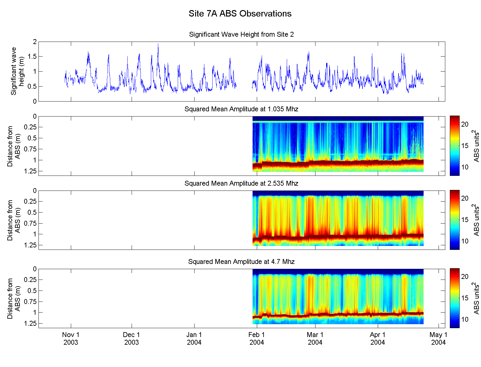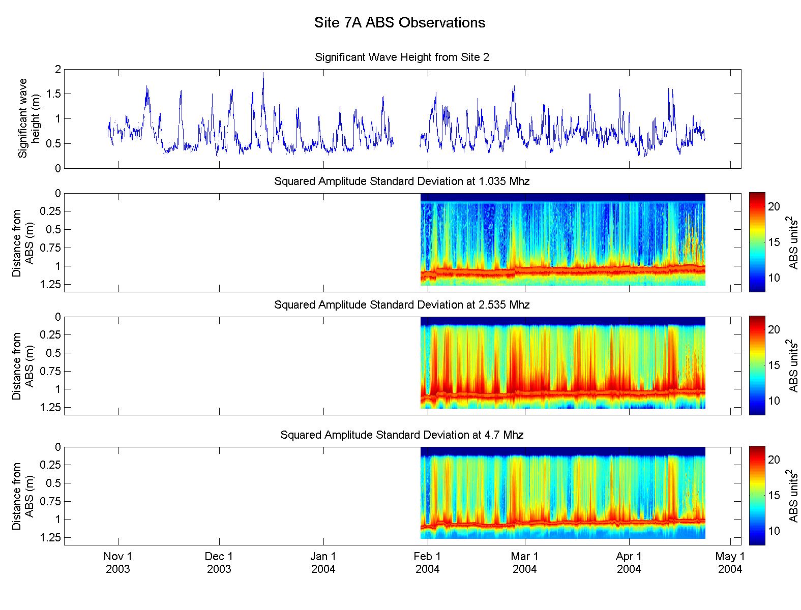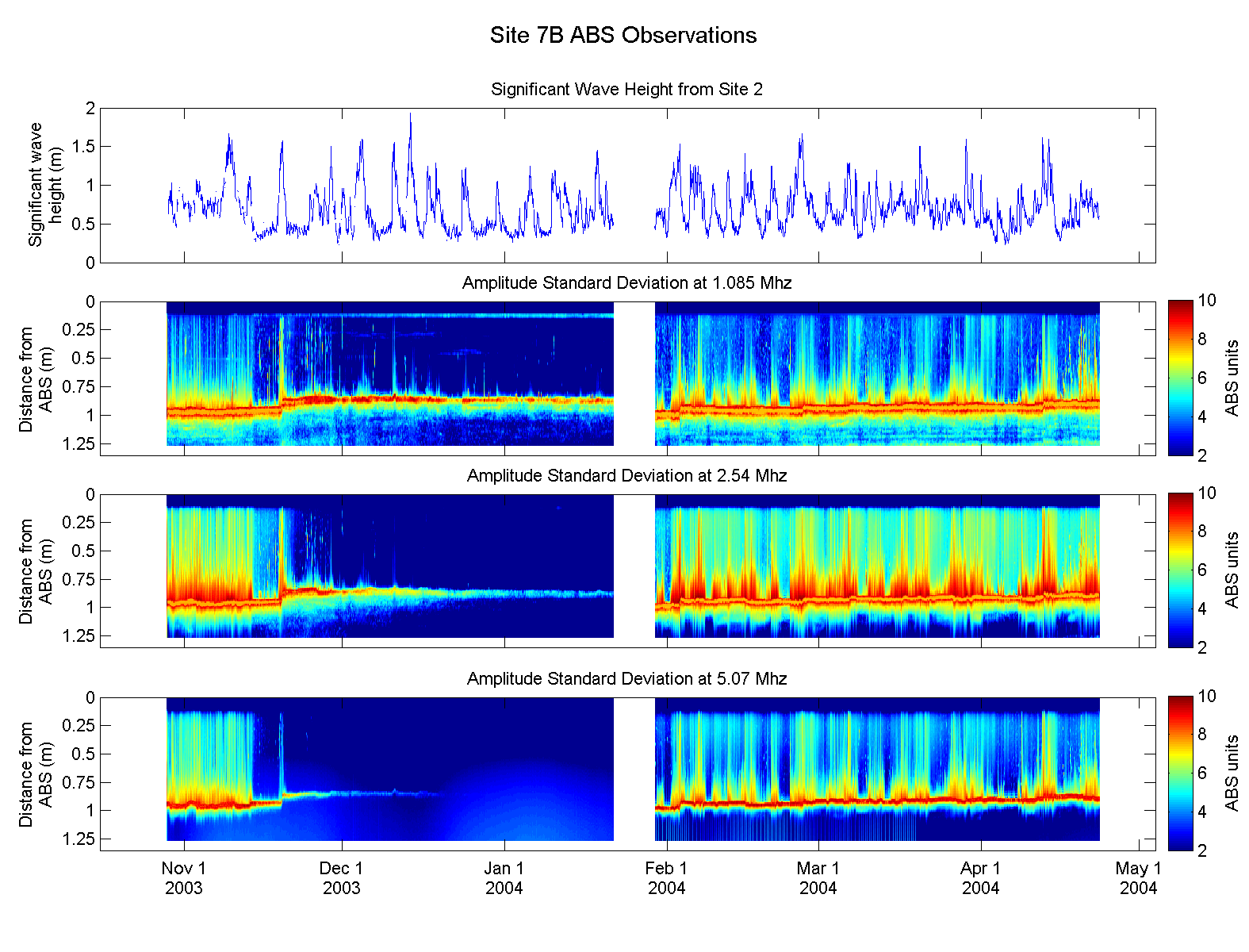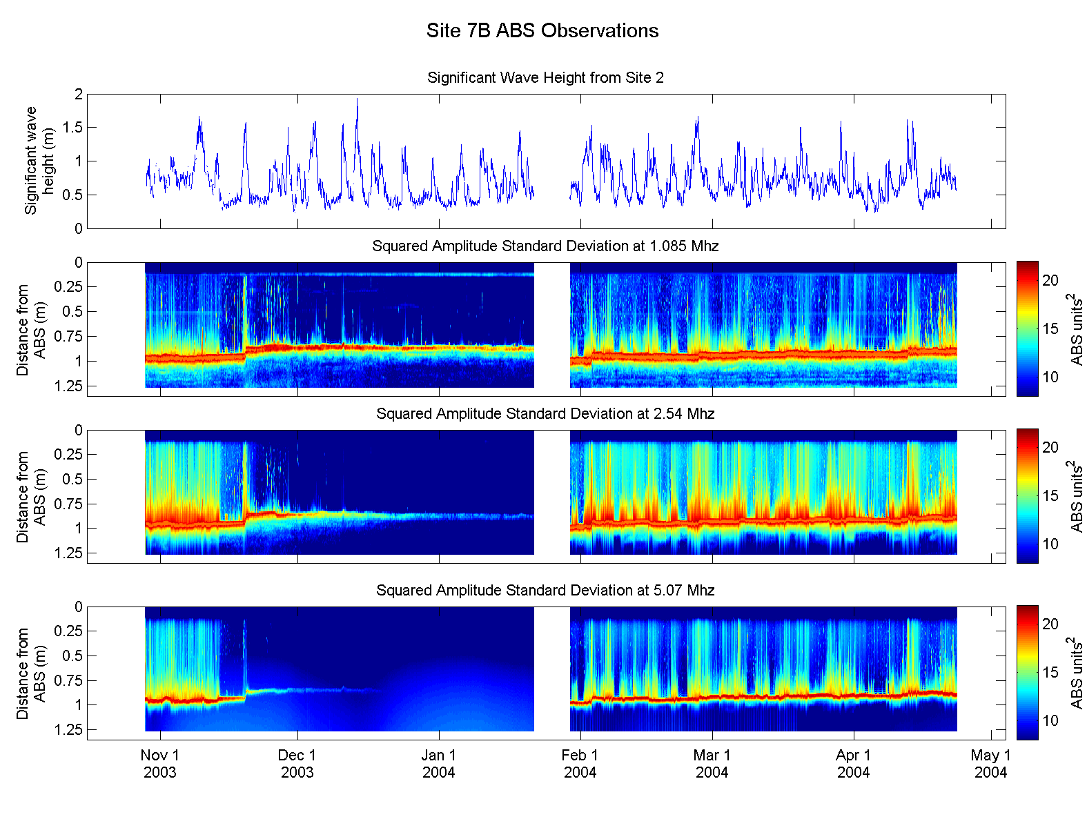 Unfiltered Acoustic Backscatter Sensor (ABS) observations: Burst-mean statistics calculated from ABS data at Site 6, Site 7A, and Site 7B. Statistics include the burst-mean, standard deviation, and percentiles for the ABS' three transducers. Squares of these statistics were also calculated. Both pdf and png versions are provided. Please note that due to the complexity of these figures, the pdf version may load slowly.