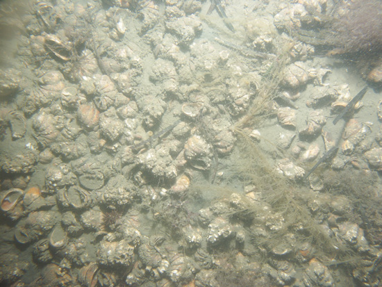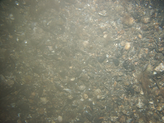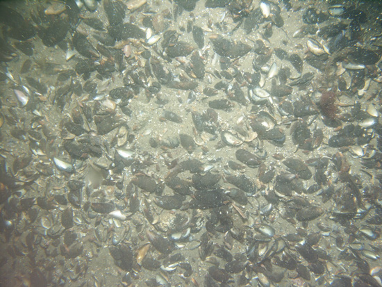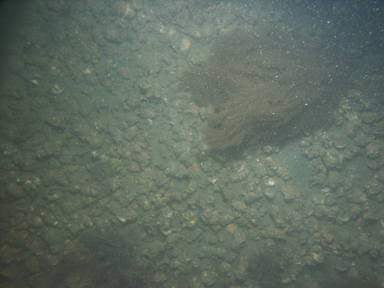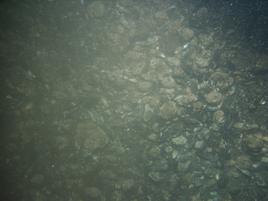 | QH48 / Abundant mussel shell debris over an undulating gravelly bottom. Skate and drifting red seaweed are present. | ||||