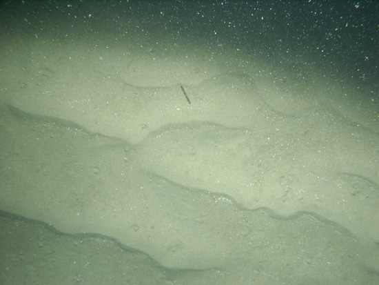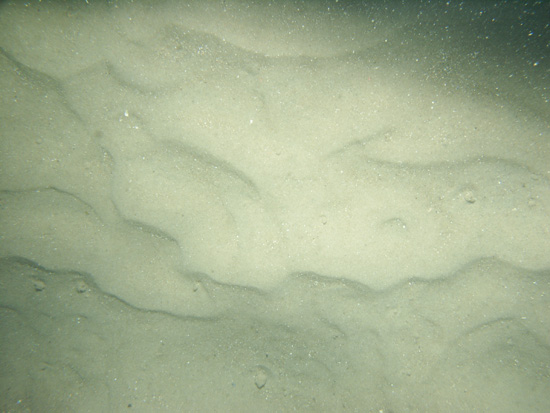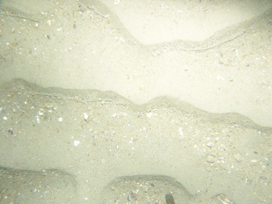 | QH62 / Current-rippled sand on megaripples. Alternating bathymetric highs and lows suggest that they are the crests and troughs of sand waves and megaripples; ripple wavelengths increase toward wave crests. Shell debris (largely mussel shells) concentrated in sand-wave troughs. Moon snail casings are present. | ||||
