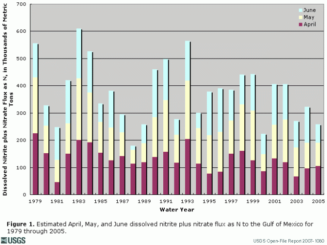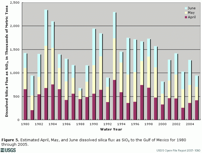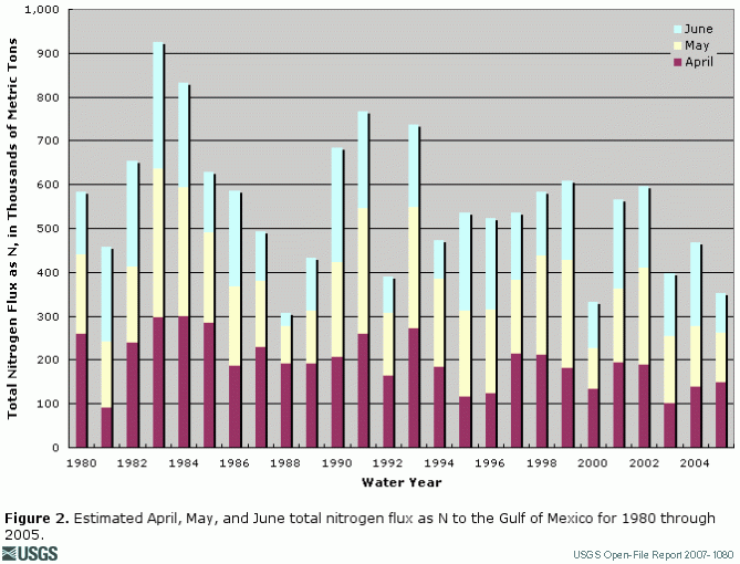 Nutrient delivery from the Mississippi-Atchafalaya River Basin to the Gulf of Mexico has been identified as one of the factors controlling the size of the hypoxic zone that forms in the northern Gulf of Mexico every summer in recent years. Each year since 1985, the Louisiana Universities Marine Consortium has measured the size of the hypoxic zone in July, when the zone is anticipated to be near its greatest extent (in recent years, additional measurements have been made at other times). Models of the relations between the size of the hypoxic zone and nutrient delivery to the Gulf of Mexico indicate that nutrient delivery during the spring has a stronger relation to hypoxic zone size than annual nutrient flux or nutrient flux for other time periods during the year (Scavia and others, 2003, and Scavia and others, 2004). For example, the two years with the lowest spring dissolved nitrite plus nitrate and total nitrogen fluxes, 1988 and 2000 (figures 1 and 2) correspond to the only two years when the area of the hypoxic zone in the northern Gulf of Mexico was less than 5,000 km2. Graphics of the spring (April, May, June) nutrient flux for the period of record for other constituents (total phosphorus, dissolved orthophosphate, and dissolved silica) are presented in figures 3, 4, and 5, respectively.