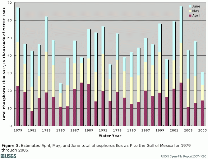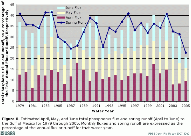 ![]() Figure 8. Estimated April, May, and June total phosphorus flux and spring runoff (April to June) to the Gulf of Mexico for 1979 through 2005. Monthly fluxes and spring runoff are expressed as the percentage of the annual flux or runoff for that water year. |