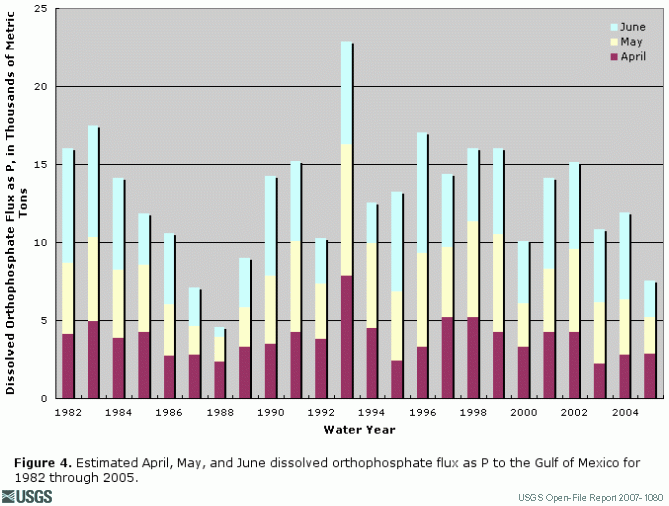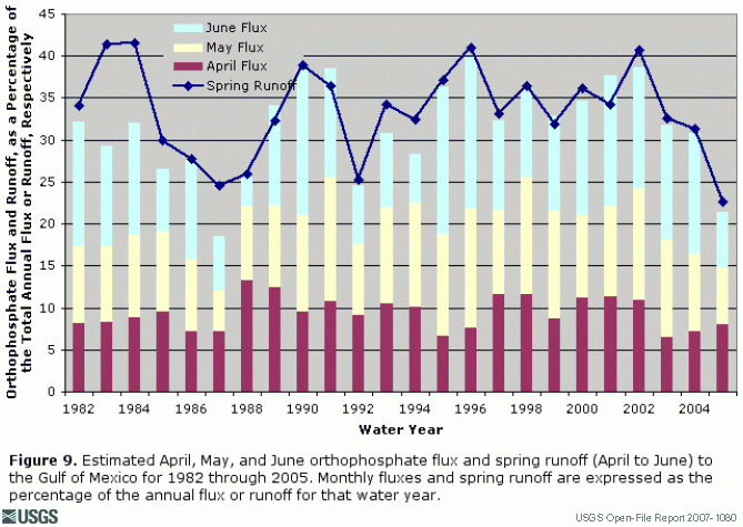 ![]() Figure 9. Estimated April, May, and June orthophosphate flux and spring runoff (April to June) to the Gulf of Mexico for 1982 through 2005. Monthly fluxes and spring runoff are expressed as the percentage of the annual flux or runoff for that water year. |