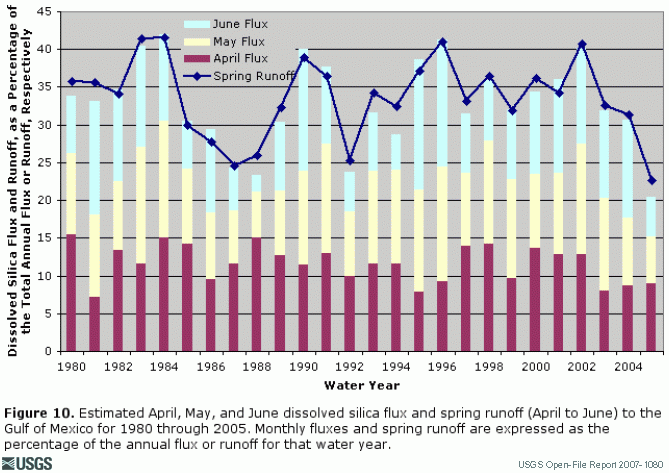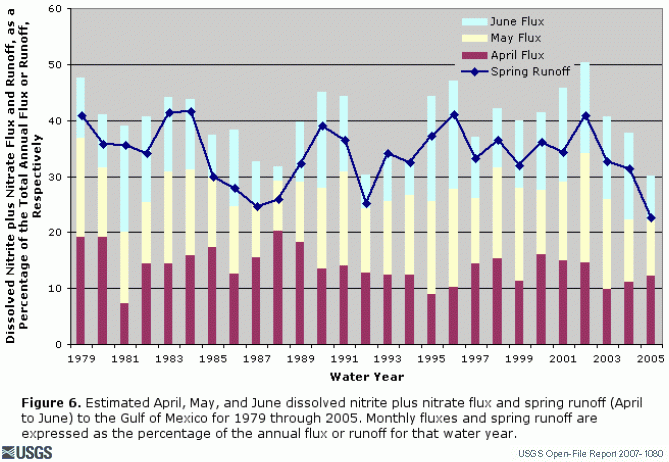 ![]() Figure 6. Estimated April, May, and June dissolved nitrite plus nitrate flux and spring runoff (April to June) to the Gulf of Mexico for 1979 through 2005. Monthly fluxes and spring runoff are expressed as the percentage of the annual flux or runoff for that water year. |