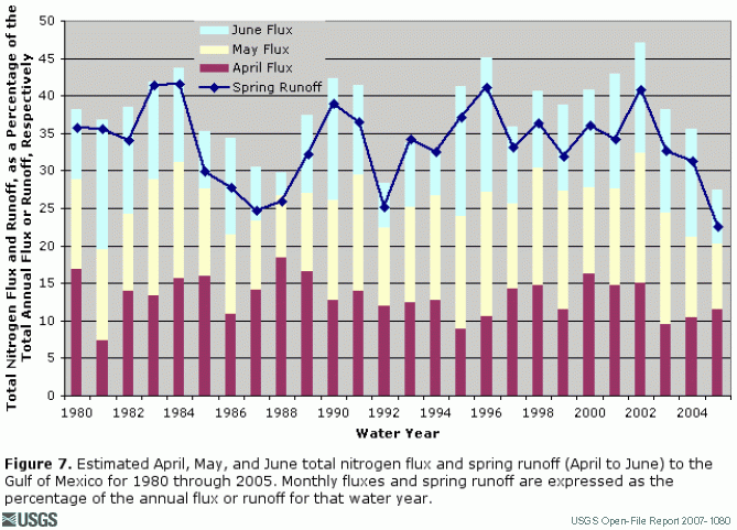 ![]() Figure 7. Estimated April, May, and June total nitrogen flux and spring runoff (April to June) to the Gulf of Mexico for 1980 through 2005. Monthly fluxes and spring runoff are expressed as the percentage of the annual flux or runoff for that water year. |