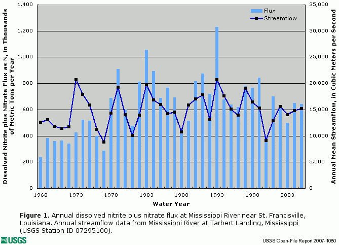 ![]() Figure 1. Annual dissolved nitrite plus nitrate flux at Mississippi River near St. Francisville, Louisiana. Annual streamflow data from Mississippi River at Tarbert Landing, Mississippi (USGS Station ID 07295100). |