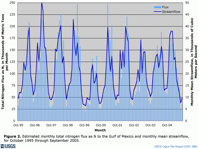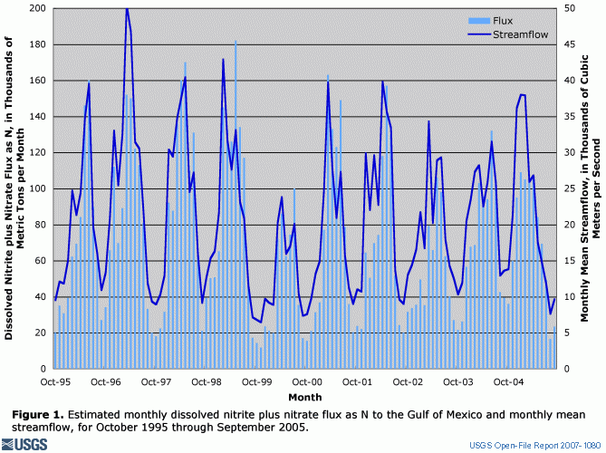 Figure 1. Estimated monthly dissolved nitrite plus nitrate flux as N to the Gulf of Mexico and monthly mean streamflow, for October 1995 through September 2005.