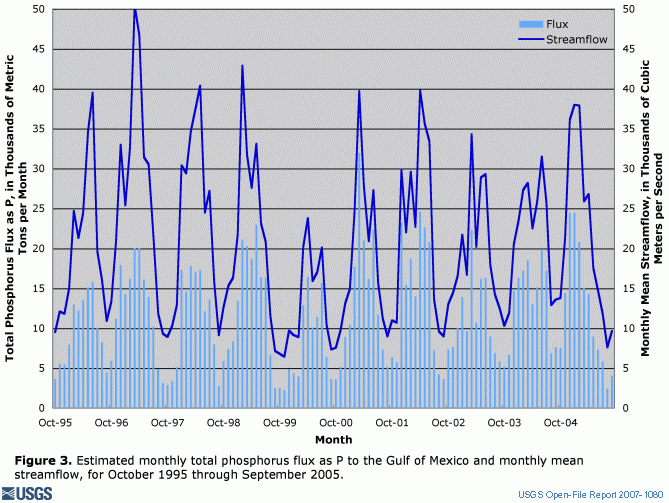 Figure 3. Estimated monthly total phosphorus flux as P to the Gulf of Mexico and monthly mean streamflow, for October 1995 through September 2005.