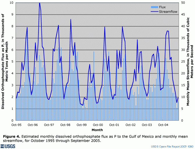 Figure 4. Estimated monthly dissolved orthophosphate flux as P to the Gulf of Mexico and monthly mean streamflow, for October 1995 through September 2005.