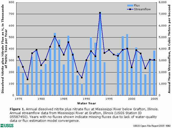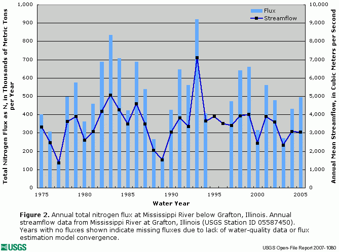 ![]() Figure 1. Annual dissolved nitrite plus nitrate flux at Mississippi River below Grafton, Illinois. Annual streamflow data from Mississippi River at Grafton, Illinois (USGS Station ID 05587450). Years with no fluxes shown indicate missing fluxes due to lack of water-quality data or flux estimation model convergence. |