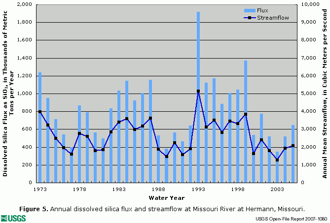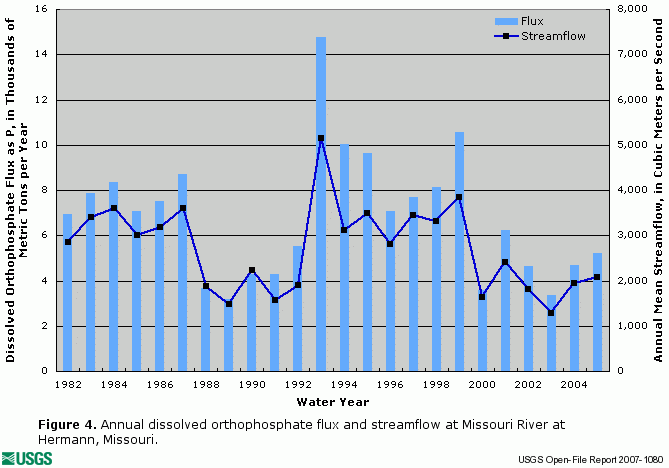 The following graphics depict annual flux of dissolved nitrite plus nitrate (figure 1), total nitrogen (figure 2), total phosphorus (figure 3), dissolved orthophosphate (figure 4), and dissolved silica (figure 5), along with concurrent annual streamflow for the Missouri River at Hermann, Missouri (Station ID 06934500).