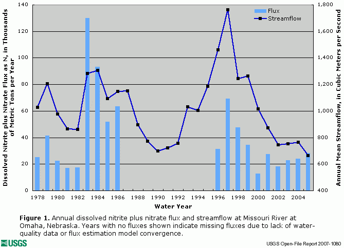 Figure 1. Annual dissolved nitrite plus nitrate flux and streamflow at Missouri River at Omaha, Nebraska. Years with no fluxes shown indicate missing fluxes due to lack of water-quality data or flux estimation model convergence.