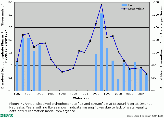 Figure 4. Annual dissolved orthophosphate flux and streamflow at Missouri River at Omaha, Nebraska. Years with no fluxes shown indicate missing fluxes due to lack of water-quality data or flux estimation model convergence.