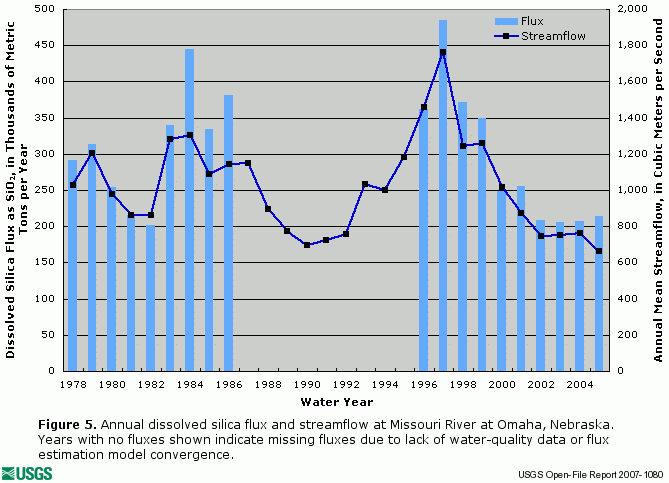 Figure 5. Annual dissolved silica flux and streamflow at Missouri River at Omaha, Nebraska. Years with no fluxes shown indicate missing fluxes due to lack of water-quality data or flux estimation model convergence.