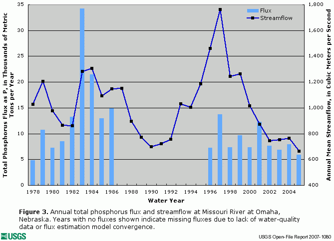 Figure 3. Annual total phosphorus flux and streamflow at Missouri River at Omaha, Nebraska. Years with no fluxes shown indicate missing fluxes due to lack of water-quality data or flux estimation model convergence.