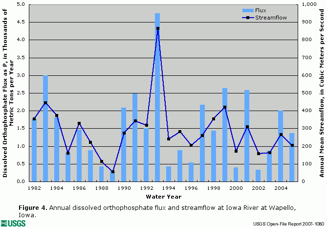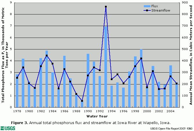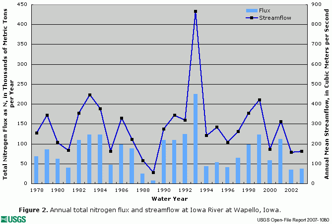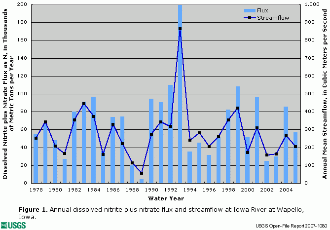 The following graphics depict annual flux of dissolved nitrite plus nitrate (figure 1), total nitrogen (figure 2), total phosphorus (figure 3), dissolved orthophosphate (figure 4), and dissolved silica (figure 5), along with concurrent annual streamflow for the Iowa River at Wapello, Iowa (Station ID 05465500).