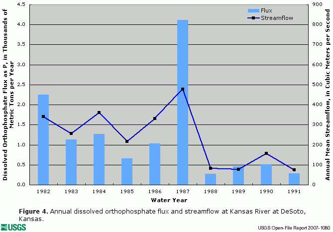 The following graphics depict annual flux of dissolved nitrite plus nitrate (figure 1), total nitrogen (figure 2), total phosphorus (figure 3), dissolved orthophosphate (figure 4), and dissolved silica (figure 5), along with concurrent annual streamflow for the Kansas River at DeSoto, Kansas (Station ID 06892350).