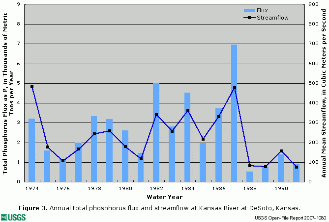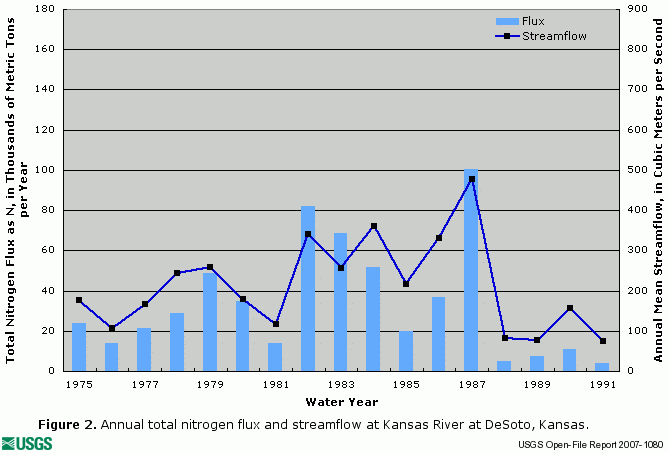 Report Site Map > Graphics of Streamflow and Nutrient Flux > Graphics for Streamflow and Nutrient Flux for Selected Mississippi River Sub-basins with Varied Sizes, Hydrology, Land Use, and Geographic Location > Graphics of Streamflow and Nutrient Flux for the Kansas River at DeSoto, Kansas