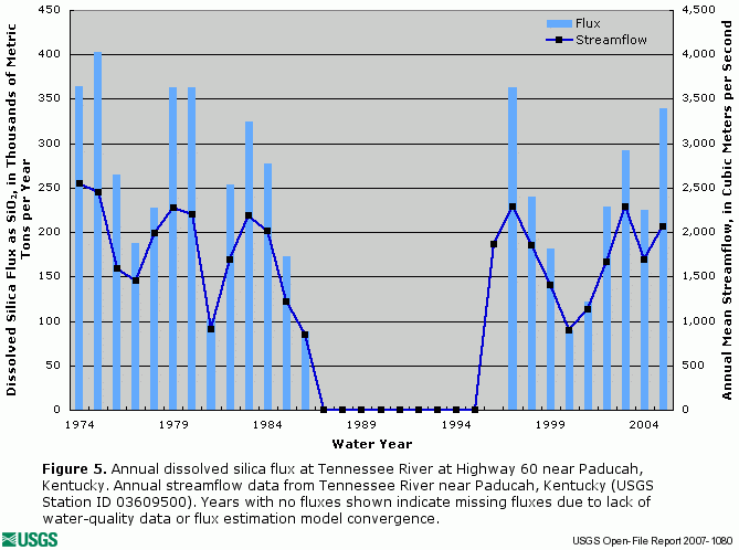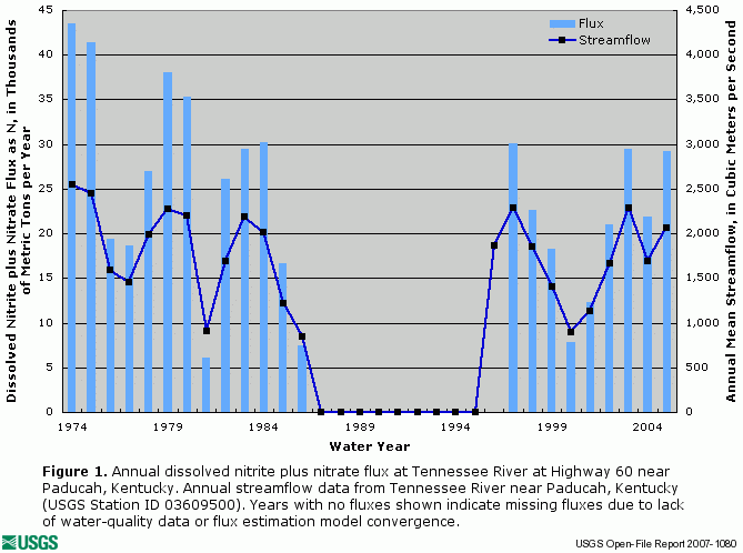 The following graphics depict annual flux of dissolved nitrite plus nitrate (figure 1), total nitrogen (figure 2), total phosphorus (figure 3), dissolved orthophosphate (figure 4), and dissolved silica (figure 5), along with concurrent annual streamflow for the Tennessee River at Highway 60 near Paducah, Kentucky (Station ID 03609750).