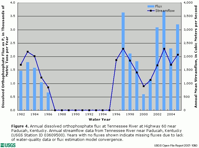 ![]() Figure 4. Annual dissolved orthophosphate flux at Tennessee River at Highway 60 near Paducah, Kentucky. Annual streamflow data from Tennessee River near Paducah, Kentucky (USGS Station ID 03609500). Years with no fluxes shown indicate missing fluxes due to lack of water-quality data or flux estimation model convergence. |