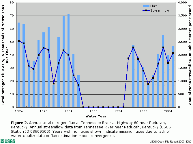 ![]() Figure 2. Annual total nitrogen flux at Tennessee River at Highway 60 near Paducah, Kentucky. Annual streamflow data from Tennessee River near Paducah, Kentucky (USGS Station ID 03609500). Years with no fluxes shown indicate missing fluxes due to lack of water-quality data or flux estimation model convergence. |