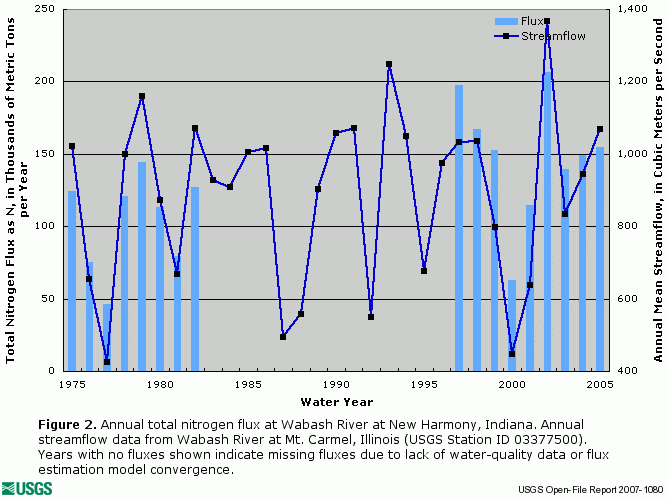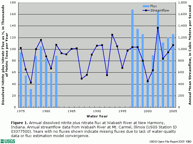 ![]() Figure 1. Annual dissolved nitrite plus nitrate flux at Wabash River at New Harmony, Indiana. Annual streamflow data from Wabash River at Mt. Carmel, Illinois (USGS Station ID 03377500). Years with no fluxes shown indicate missing fluxes due to lack of water-quality data or flux estimation model convergence. |