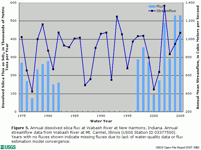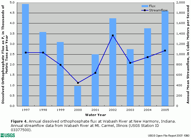 ![]() Figure 4. Annual dissolved orthophosphate flux at Wabash River at New Harmony, Indiana. Annual streamflow data from Wabash River at Mt. Carmel, Illinois (USGS Station ID 03377500). |